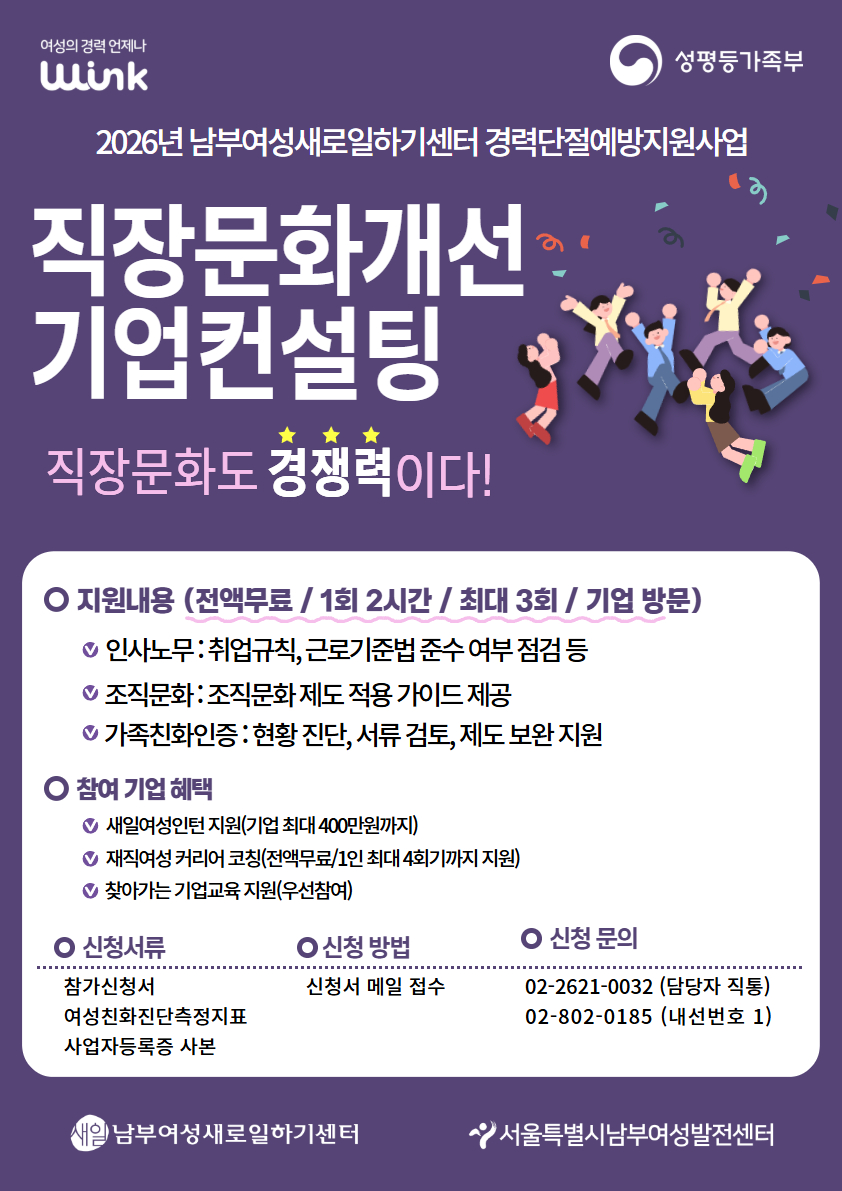 ㅇ 이메일 nambujob@seoulwomanup.or.kr (제목: 기업컨설팅 참여_기업명)